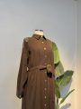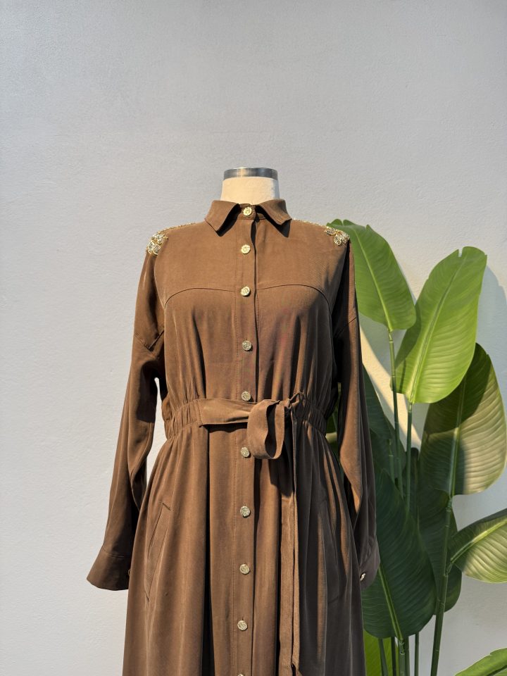 Boydan düğmeli yapısı hem kullanım kolaylığı hem de modern bir görünüm sunarken, kahverengi tonunun sıcak ve zamansız havası ürünü dört mevsim kullanılabilir hale getirir. Günlük kullanımda tesettür günlük elbise olarak rahatlıkla tercih edilebilecek bu model, doğru aksesuarlarla tesettür abiye modelleri kadar şık bir görünüm de sunabilir. Yeni sezon tesettür trendlerine uyumlu yapısıyla gardırobunuzun çok yönlü parçalarından biri olmaya adaydır.