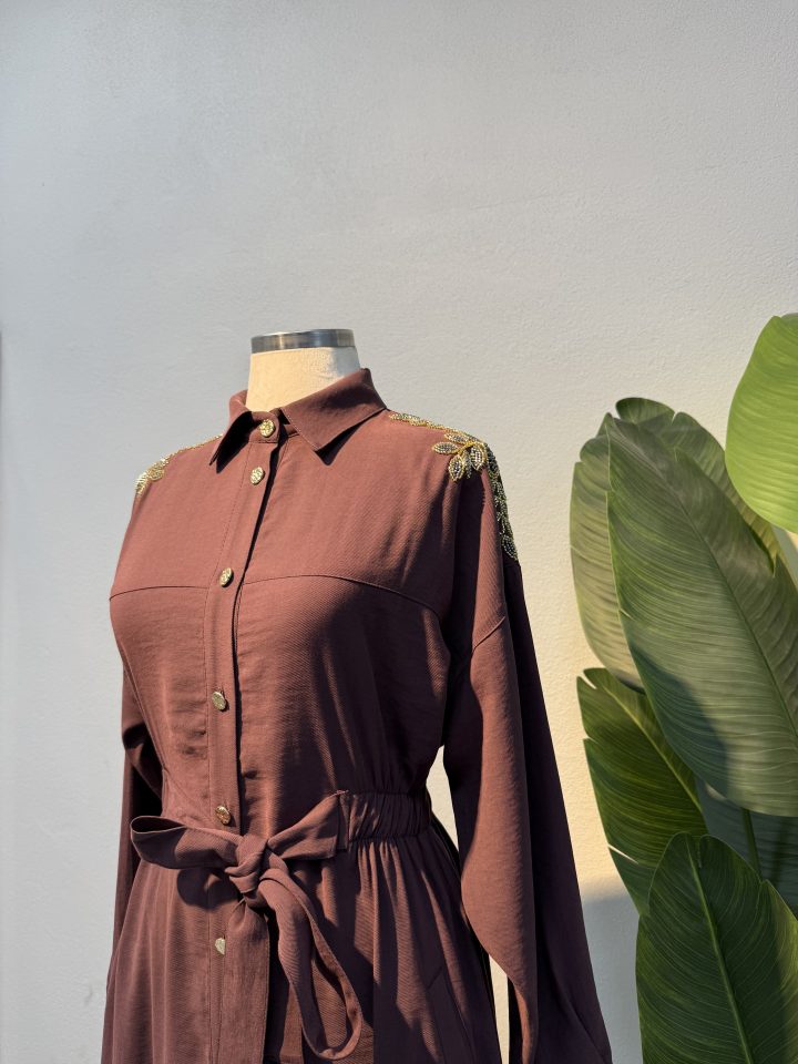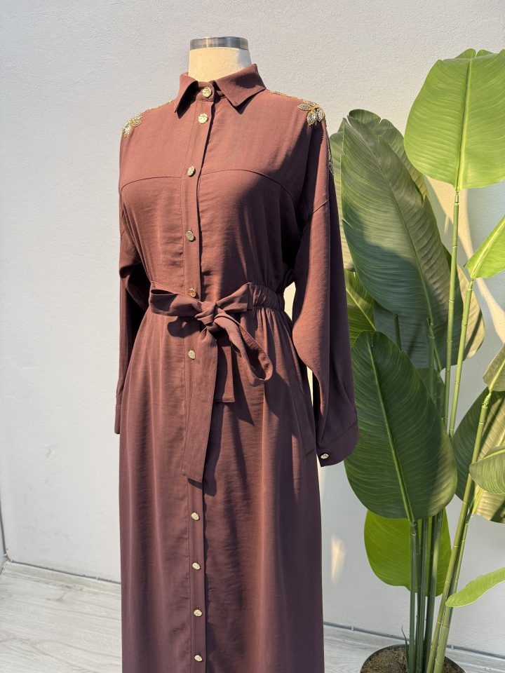 Entare Butik yeni sezon tesettür giyim koleksiyonunun dikkat çeken parçalarından Omuz Nakışlı Düğmeli Elbise – Mürdüm, zarif nakış detayları ve asil tonu ile modern şıklığı bir araya getiriyor. Keten&Qupra kumaşın hafif ve nefes alabilen yapısı sayesinde gün boyu konfor sağlarken, 137 cm uzunluğu ile kapalı giyim stiline uygun zarif bir duruş sunar. Omuz kısmındaki özel nakış işlemeleri elbiseye estetik ve dikkat çekici bir görünüm kazandırır.