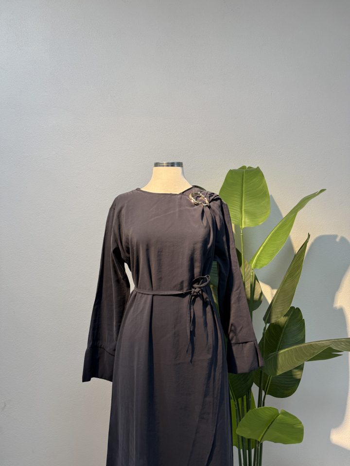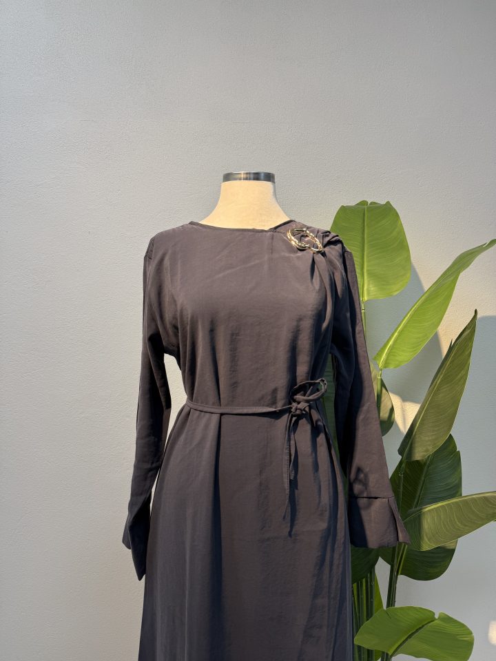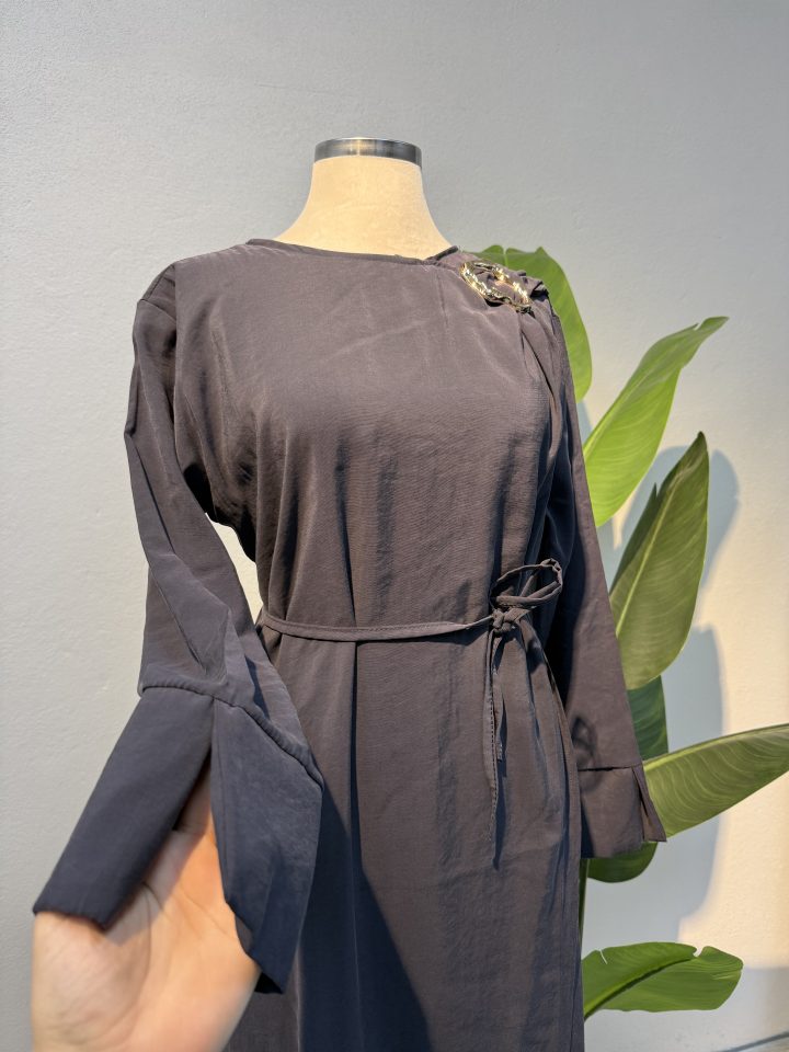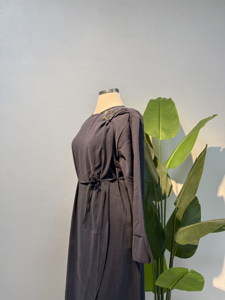 Elbise üzerindeki toka detayı, tasarıma modern ve dikkat çekici bir dokunuş kazandırır. Antrasit rengin güçlü ve sofistike duruşu, bu modeli hem günlük hem de özel kombinlerde tercih edilebilir hale getirir. Günlük kullanımda tesettür günlük elbise olarak rahatlıkla kullanılabilirken, şık aksesuarlarla tamamlandığında tesettür abiye modelleri kadar etkileyici bir görünüm elde edilebilir. Yeni sezon tesettür trendlerine uyum sağlayan yapısıyla çok yönlü bir kullanım sunar.