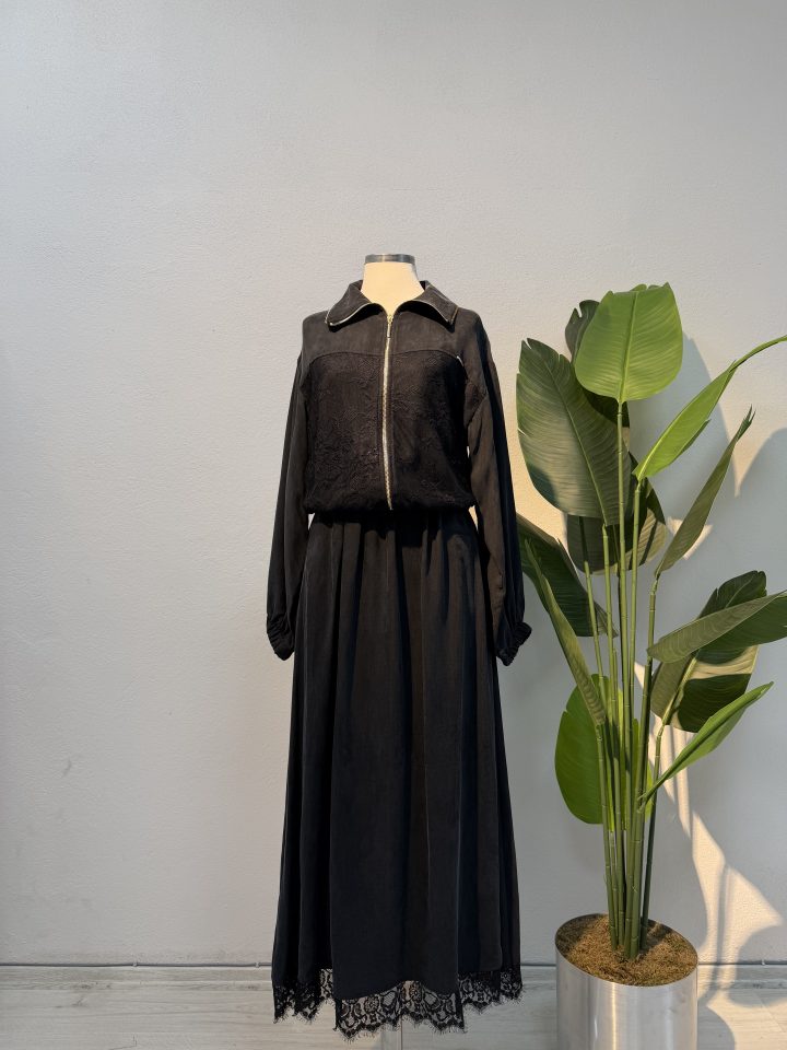 Takımın etek kısmında yer alan 6 cm güpür detayı tasarıma feminen ve sofistike bir hava katar. Bel kısmı lastikli olan etek, gün boyu konfor sağlarken formunu korur. Tesettür elbise şıklığını iki parçalı rahat bir tasarımla sunan bu model, hem günlük kullanım hem de özel davetler için ideal bir alternatiftir. Yeni sezon tesettür trendlerine uyum sağlayan tasarımı sayesinde tesettür kombin önerileri arayanlar için güçlü bir seçenektir.