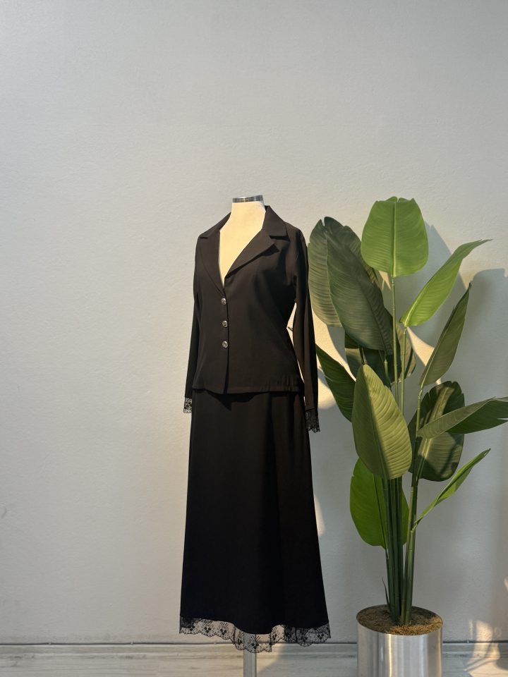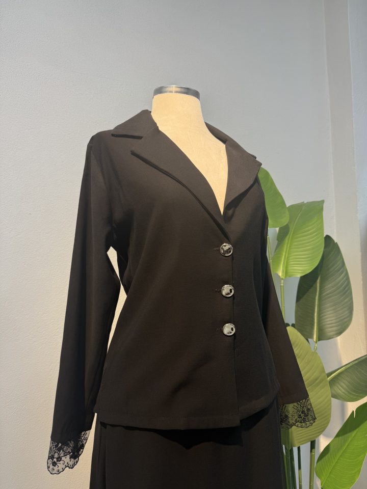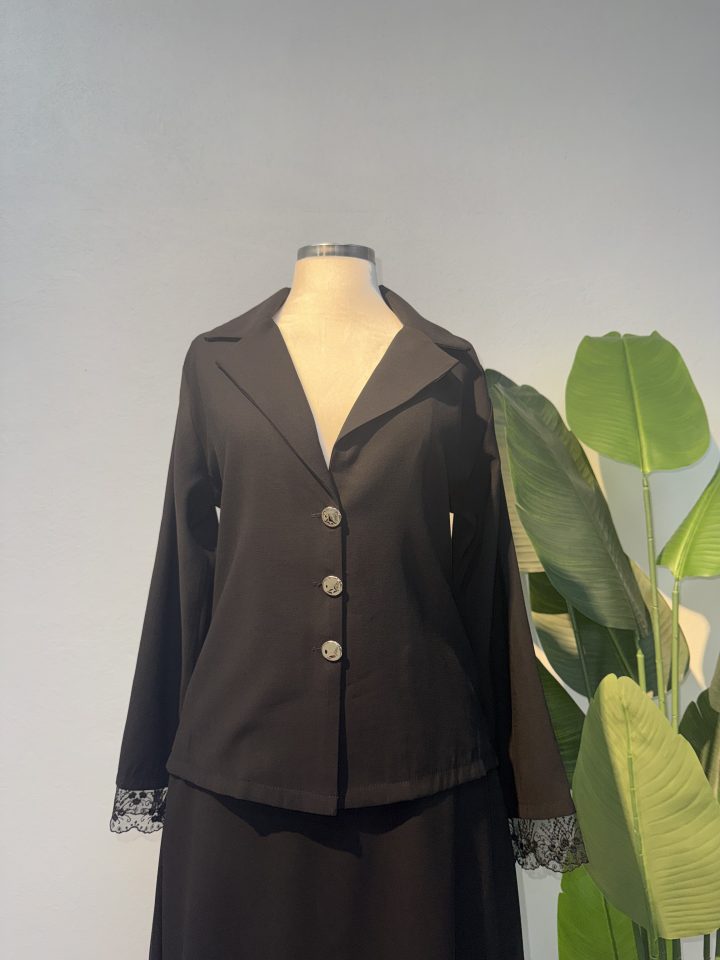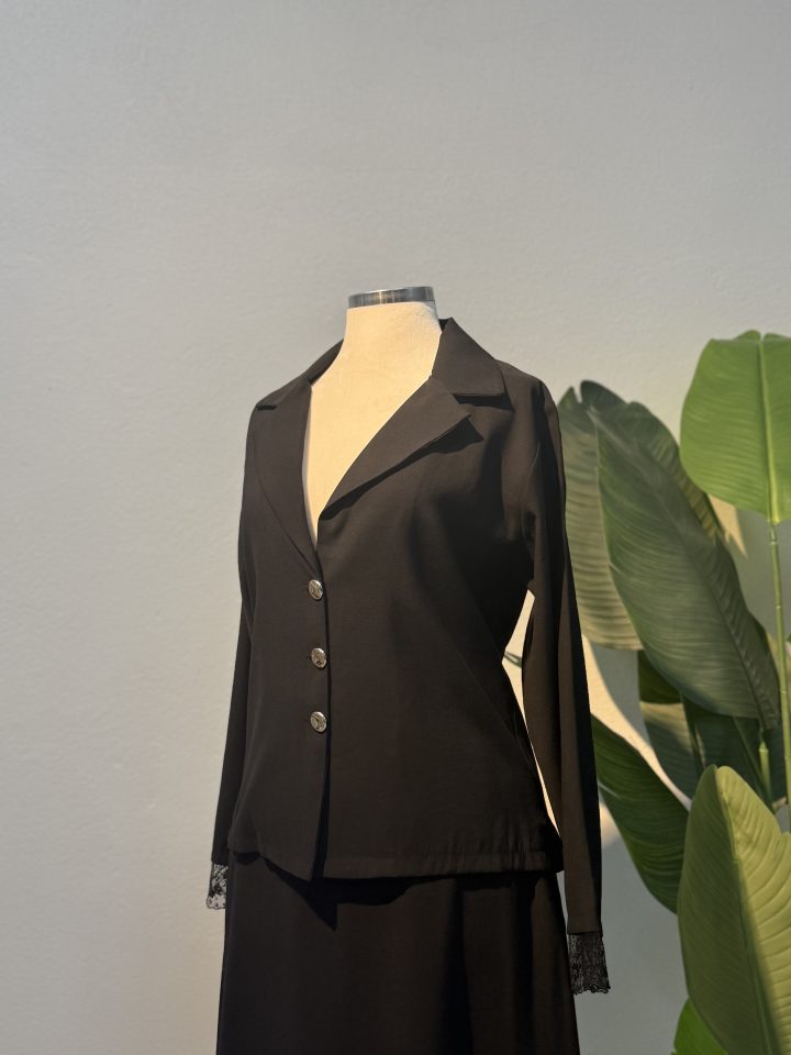 Ceket kol uçlarında ve etek ucunda yer alan 5 cm uzunluğundaki zarif güpür detayı tasarıma feminen bir dokunuş katar. Yan fermuarlı etek yapısı hem pratik kullanım hem de düzgün bir form sunar. Tesettür tunik rahatlığını andıran üst kesimi ile hareket özgürlüğü sağlar. Günlük kullanımda sade bir şıklık sunarken, özel günlerde tesettür abiye modelleri kadar iddialı olmasa da zarif bir alternatif oluşturur.