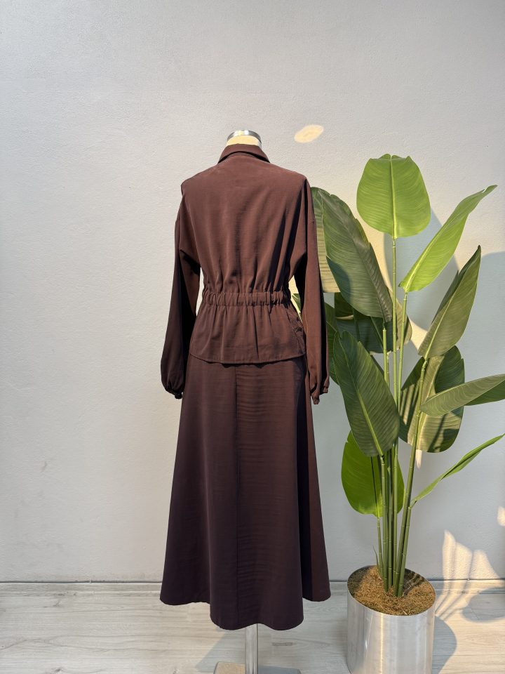 Etek kısmının arka fermuarlı yapısı kullanım kolaylığı sağlarken, tasarımın formunu gün boyu korumasına yardımcı olur. Şal ve eşarp modelleri ile ton sür ton mürdüm kombinler oluşturabilir ya da açık ton aksesuarlarla kontrast bir görünüm elde edebilirsiniz. Tesettür kombin önerileri arasında yer alabilecek bu model, tesettür elbise şıklığını takım rahatlığıyla sunar.