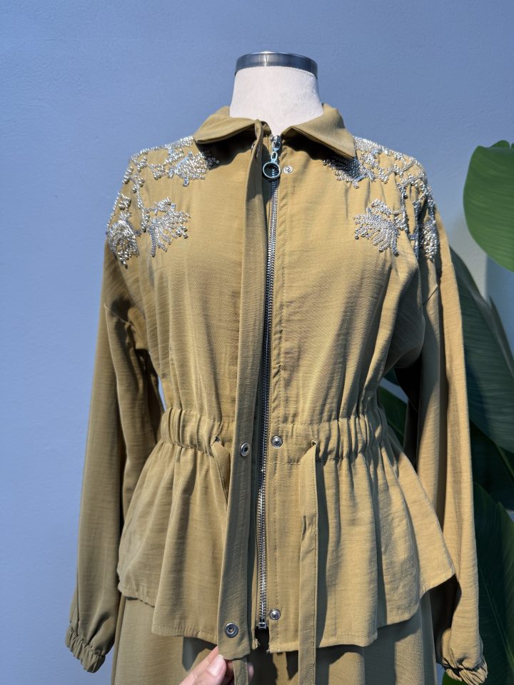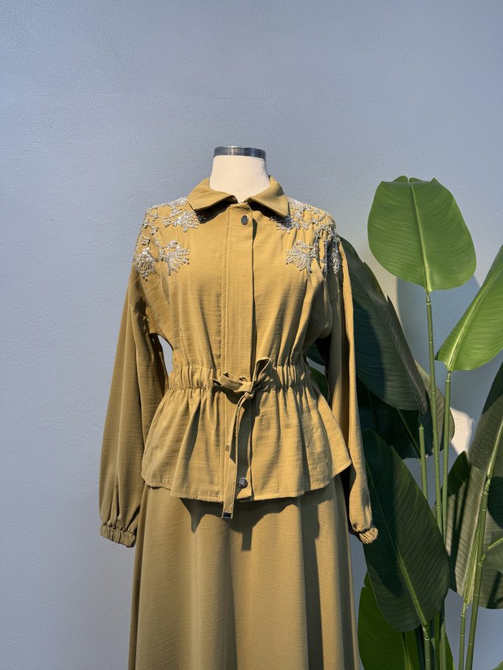 Yağ yeşilinin sofistike ve doğal görünümü, işleme detaylarıyla birleşerek ürüne özel bir karakter kazandırır. Şık davetlerde, özel günlerde ya da zarif günlük kombinlerde rahatlıkla tercih edilebilir. Tesettür abiye modelleri kadar dikkat çekici bir duruş sunarken, sade aksesuarlarla günlük kullanıma da uyarlanabilir. Yeni sezon tesettür trendlerine uyum sağlayan tasarımıyla gardırobunuzun en özel parçalarından biri olmaya adaydır.