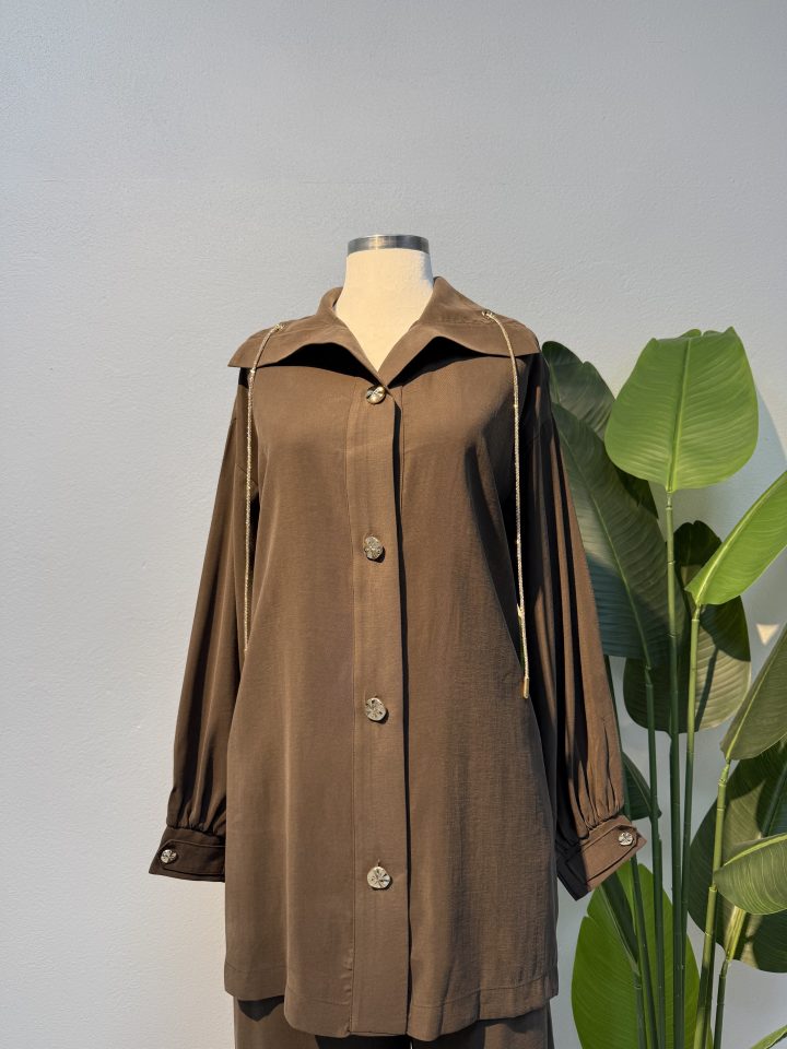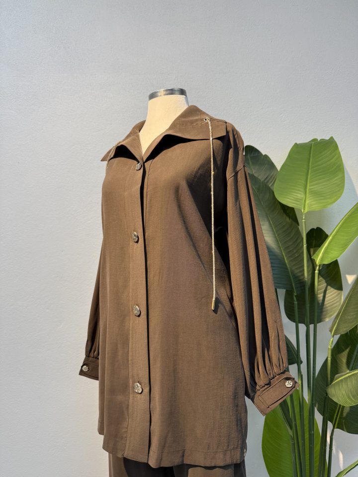 Acı kahverenginin derin ve sıcak tonu özellikle sonbahar ve kış kombinlerinde etkileyici bir görünüm oluşturur. 102 cm pantolon boyu ile zarif bir siluet sunarken, bel kısmının lastikli ve cepli olması kullanım kolaylığı sağlar. Günlük şehir hayatında, ofis stilinde ya da özel buluşmalarda rahatlıkla tercih edilebilecek bu takım, tesettür kombin önerileri arayanlar için hem şık hem konforlu bir alternatiftir.